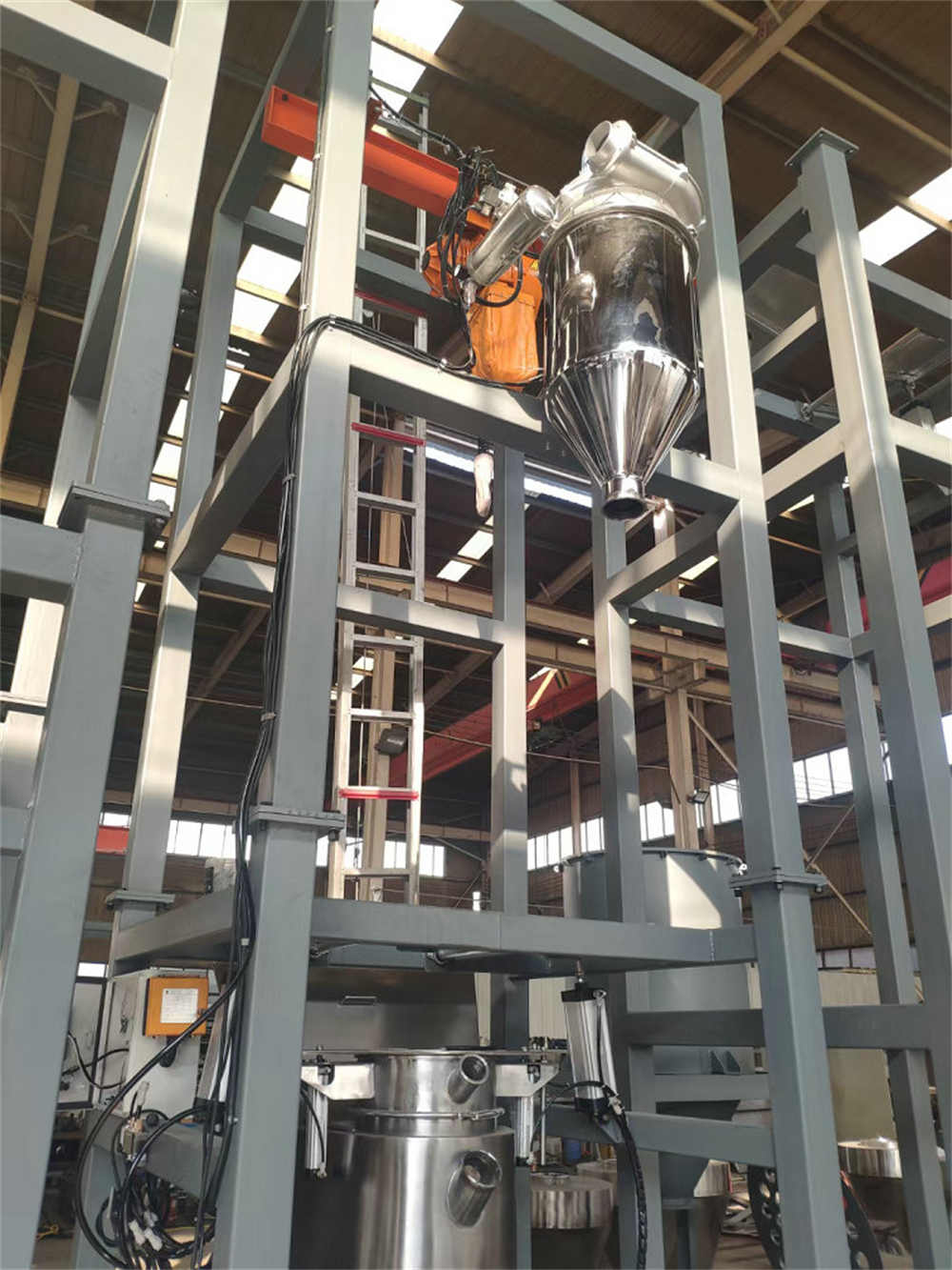 噸包投料站又稱噸袋拆包機,是用來實現袋裝散裝物料的卸料功能,為半自動操作。包裝袋由電動葫蘆提升,包裝袋的袋繩掛在鋼性支架上,手動操作控制葫蘆升降和行走,沿著行走導軌運行到卸料區上方落下,將包裝袋放置在支架托盤上,使大袋處于卸料位置。然后手動打開卸料閥操作門,人工將包裝袋的卸料口拉入到卸料閥的系口出,按下系帶按鈕,卸料閥束緊氣缸將袋口鎖緊,再手動將大袋的卸料口從卸料位置拉下,罩在卸料口密封箱內的出料管外側,按下壓袋機構氣動控制開關,使密封法蘭下降,并緊壓在出料管的管端,密封卸料通道,以防卸料過程中粉塵漏,接著,人工解袋,關上操作門。手動開啟與卸料口密封箱連接的通風除塵管道上的閥門。至此,卸料準備過程結束。