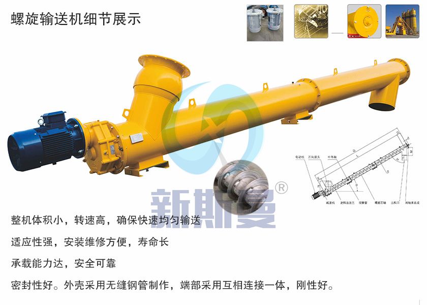 LS型螺旋輸送機是利用旋轉的螺旋將被輸送的物料沿固定的機殼內推移而進行輸送工作,頭部及尾部軸承移至殼體外,吊軸承采用滑動軸承設有防塵密封裝置,軸瓦一般采用粉末冶金,輸送水泥采用毛氈軸瓦,吊軸和螺旋軸采用滑塊連接。