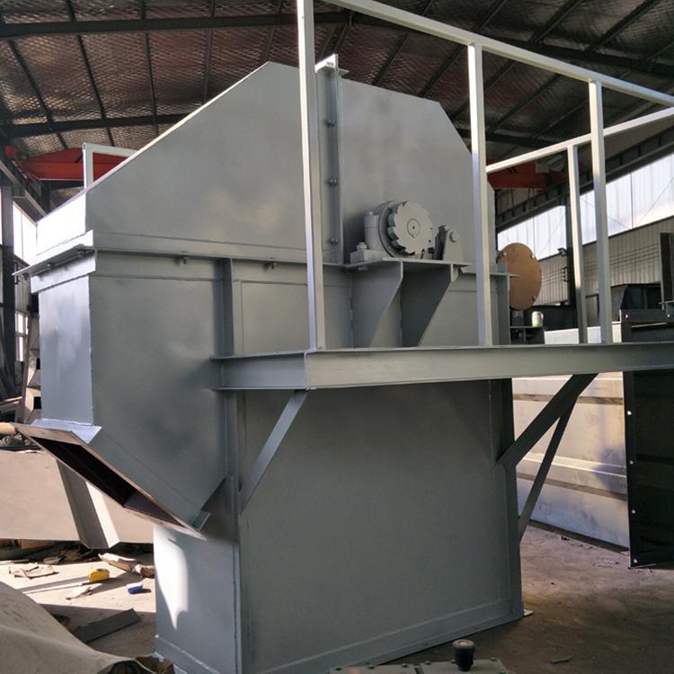 1、上部裝置:安裝有軌道(雙排道),防止鏈條擺動(dòng),逆止器,防止料斗回轉(zhuǎn),物料阻滿下部機(jī)殼,卸料口裝有橡膠板防止回料。