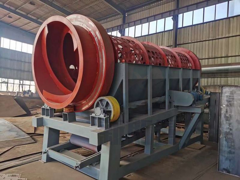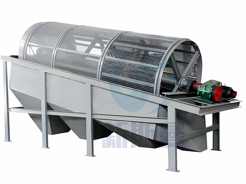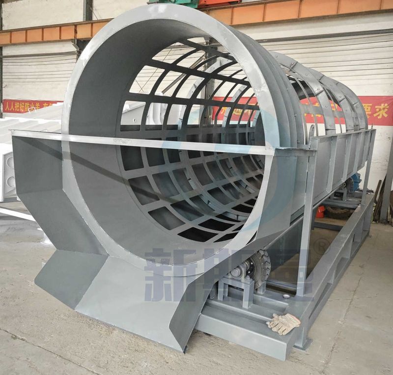 滾筒篩也叫滾筒篩沙機,滾筒篩分機,它的主體部分是篩分筒,有若干個圓型狀沙王組成,過變速減速系統使篩分筒在一定轉速下旋轉,物料自上而下通過篩分筒得到分離,細料從篩分筒前端下部排出,粗料從篩分筒下端尾部排出,以此來完成物料的分級篩選。