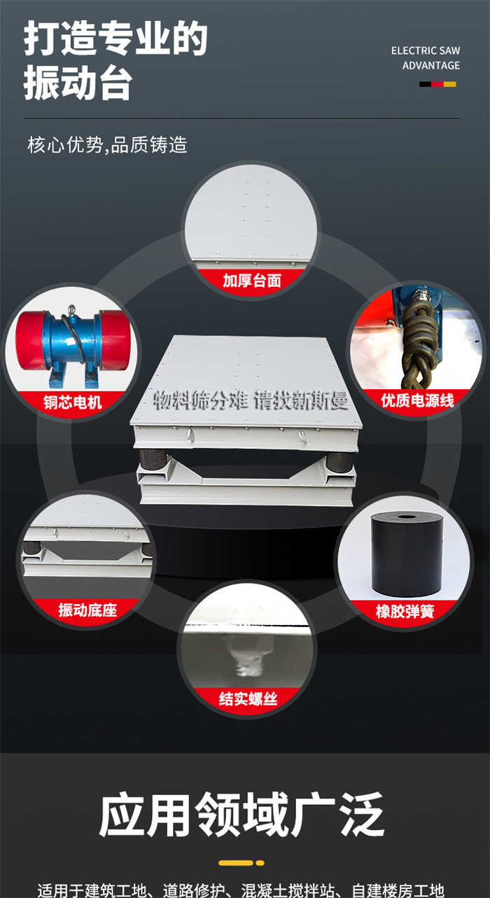 被廣泛應(yīng)用于試驗(yàn)室、現(xiàn)場工地作試件成型和預(yù)制構(gòu)件震實(shí)各種板柱、梁等混凝土構(gòu)件振實(shí)成型,并應(yīng)用在冶金、模具、食物、化工、建材等行業(yè)。