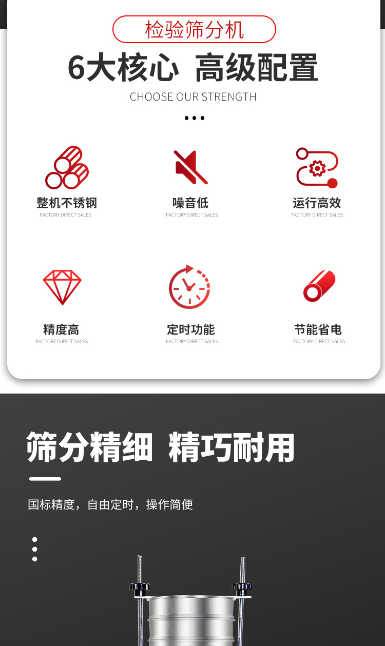 “機械篩分”將篩子按孔徑大小疊在一起,給料放在頂上一層篩子上,并加上蓋和底盤,一般疊5~6個篩子。然后放在機械振篩器上進行機械振動篩分。通常,振動時間為20分鐘。檢測篩分質量時,再用振篩器振篩器振篩5分鐘,如每分鐘篩下量小于0.2%試驗樣量即為合格,對于粗粒物料,過篩率小于1%即可。如篩分過程中損失量超過總篩分量的0.5%時,試驗必須重新取樣進行。為避免損失和延長篩分時間,有時在開始篩分時先用細的篩子將粉塵篩除。