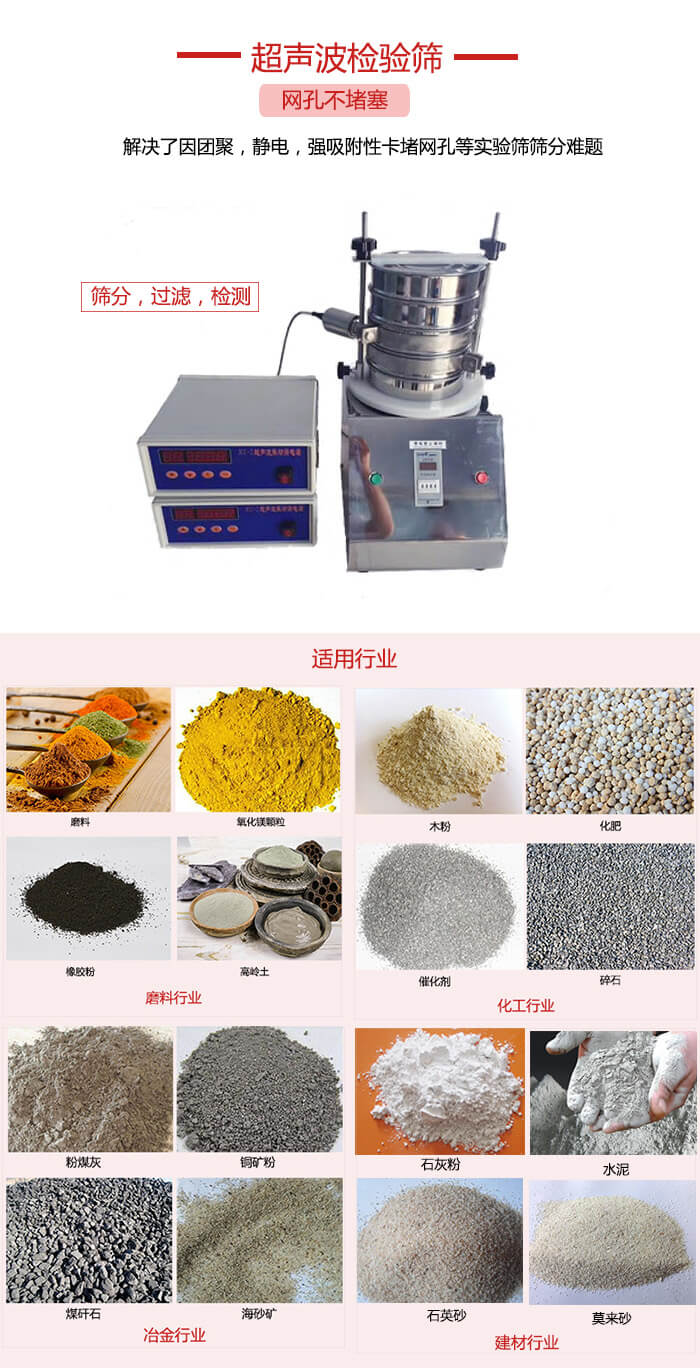 超聲波檢驗篩在JYS-200標準檢驗篩的基礎上研發的高科技微細粉分級設備,是當前在做微細粉分樣篩選時網孔堵塞的有效的解決儀器。