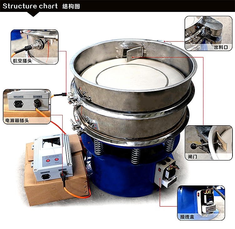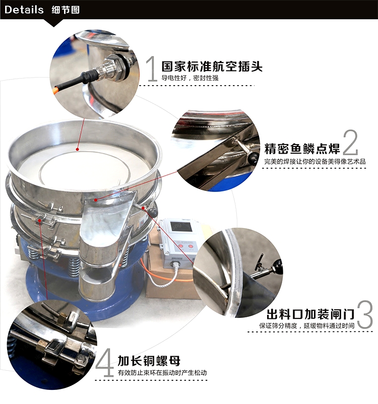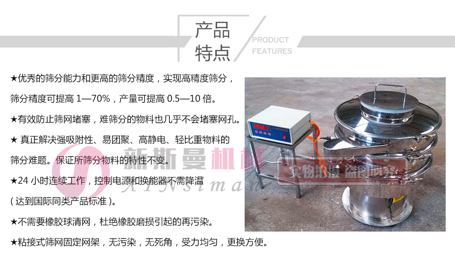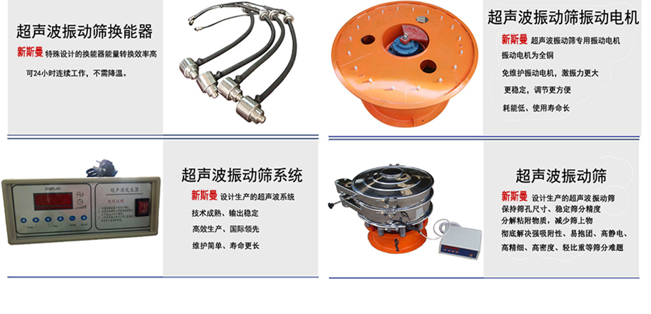 超聲波振動篩是在旋振篩的基礎(chǔ)上引入了超聲波清網(wǎng)裝置,通過將220V、50Hz或110V、60Hz電能轉(zhuǎn)化為18KHz的高頻電能,輸入超聲換能器,將其變成18KHz機(jī)械振動,從而達(dá)到高效篩分和迅速清網(wǎng)的目的,使超微細(xì)粉篩分成為易事。該系統(tǒng)在傳統(tǒng)的振動篩基礎(chǔ)上在篩網(wǎng)上引入一個低振幅、高頻率的超聲振動波(機(jī)械波),以改善超微細(xì)粉體的篩分性能。特別適合高附加值精細(xì)粉體的用戶使用。超聲波篩分系統(tǒng)是一種簡單實(shí)用、可靠的篩分系統(tǒng),是當(dāng)前網(wǎng)孔堵塞的有效的解決方法。可廣泛應(yīng)用于制藥、冶金、化工、選礦、食品等要求精細(xì)篩分過濾的行業(yè),篩分過濾精度高,有效解決因團(tuán)聚、靜電、強(qiáng)吸附性卡堵網(wǎng)孔等篩分難題,是國內(nèi)篩分行業(yè)的一項(xiàng)重大技術(shù)突破。