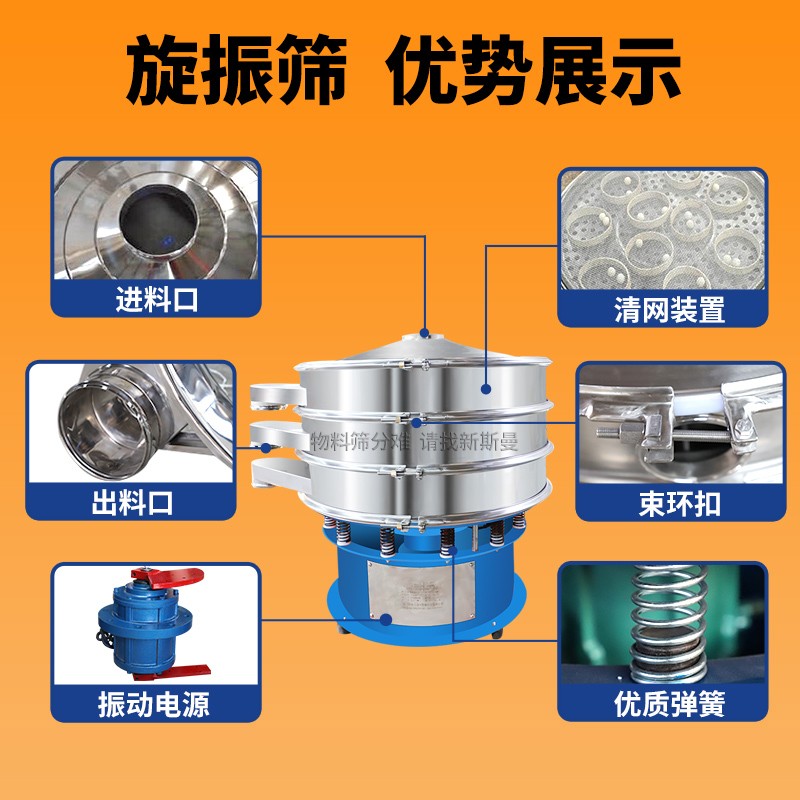 全封閉結構,粉末不飛揚、液體不泄露、網孔不堵塞、自動排放、機內無存料、網架結構無死角、篩網 使用面積增加。